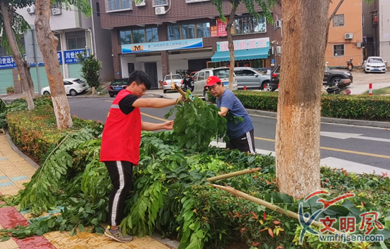 在锦绣祥安小区里,由区建设与交通局党员干部组成的“抢险救援队”冒雨忙碌着:将倒伏的树木扶起加固,对断裂的树枝进行修剪,将落叶清理运走……