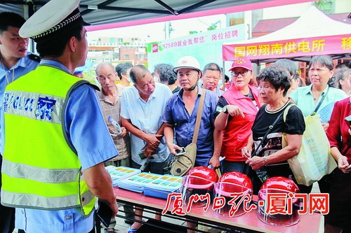 新店交警中队交警宣传文明驾驶,并向环卫工人和快递员送安全头盔。(陈翰 摄)