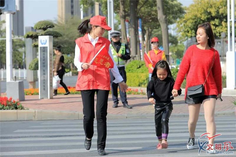 志愿者在十字路口引导行人过马路(翔安区委文明办供图)