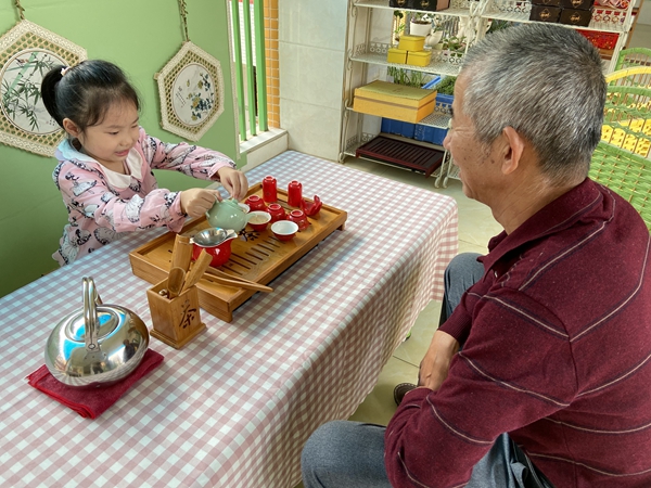 安溪十幼的小朋友向长辈献菊花茶。吴小燕 供图