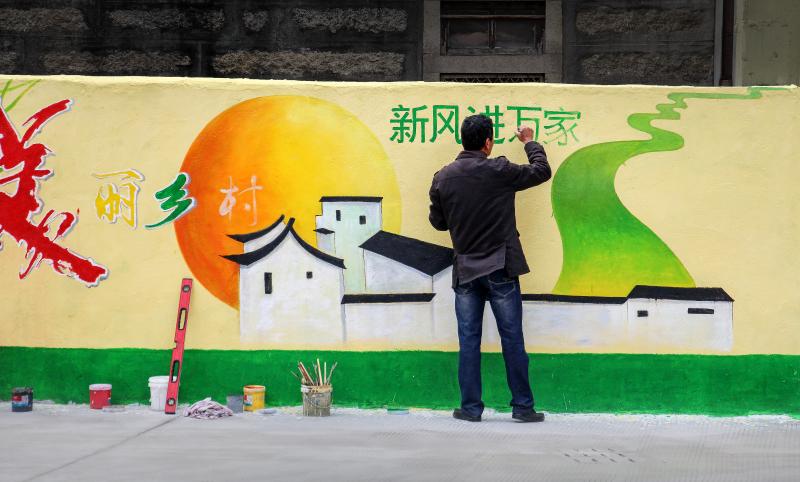 文艺志愿者在围墙上绘画《新风进万家》(泉港区委文明办供图 李集彬摄)