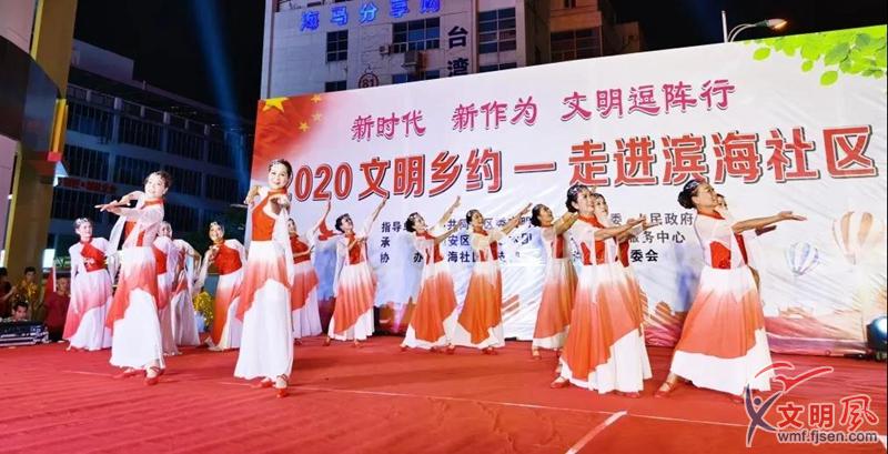 文明风11月5日讯(通讯员 文洁 邹玒 吴婷婷)欢快的笑脸,蹦跳的脚步,飘扬的红绸,换来居民们热情的掌声。1日晚,在厦门市同安区委文明办、西柯镇党委政府的指导下,同安区西柯镇文化服务中心携手滨海社区、同安金秋艺术团在滨海社区安居乐享广场举办“新时代、新作为、文明逗阵行,2020文明乡约·一起走进滨海”新时代文明实践活动。