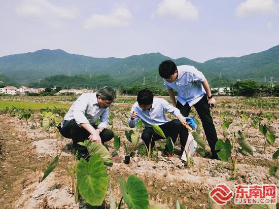 集美大学副校长曹敏杰教授(左)和他带领的师生团队在灌口镇田头村测量仙景芋土壤酸碱度。 颜龙杰 摄