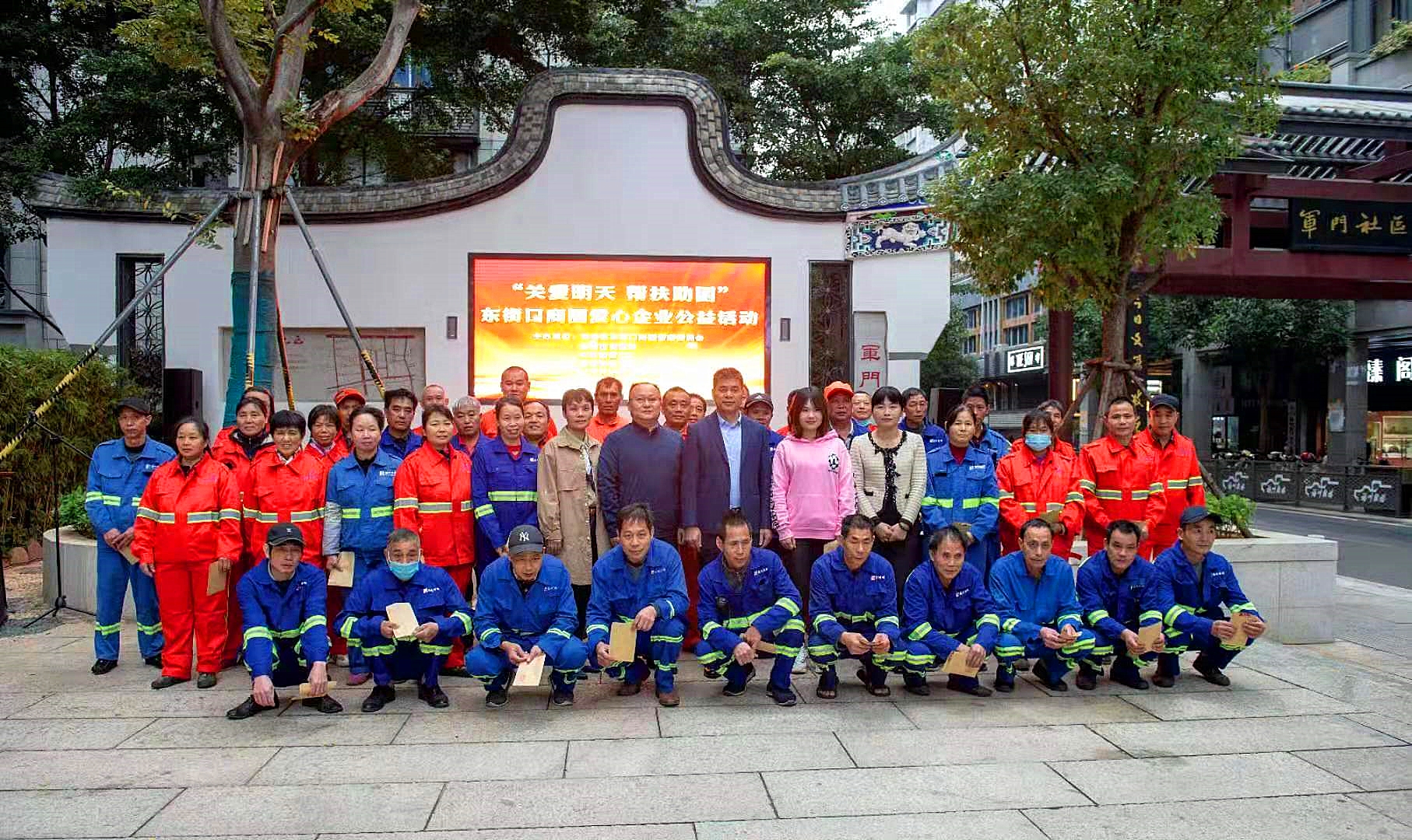 当天下午,爱心捐赠活动在军门社区文化广场举行。鼓楼区东街口商圈爱心企业--“时光不散”潮汕牛肉火锅餐厅,准备了近万元现金、约6万元用餐抵用券,捐赠给鼓楼区困境儿童和环卫工人。在现场,鼓楼区民政局代表接受现金捐赠,送给鼓楼辖区30多名困境儿童。环卫工人代表接受用餐抵用券捐赠,100多名在东街口周边工作的环卫工人,每人将收到500元用餐抵用券。