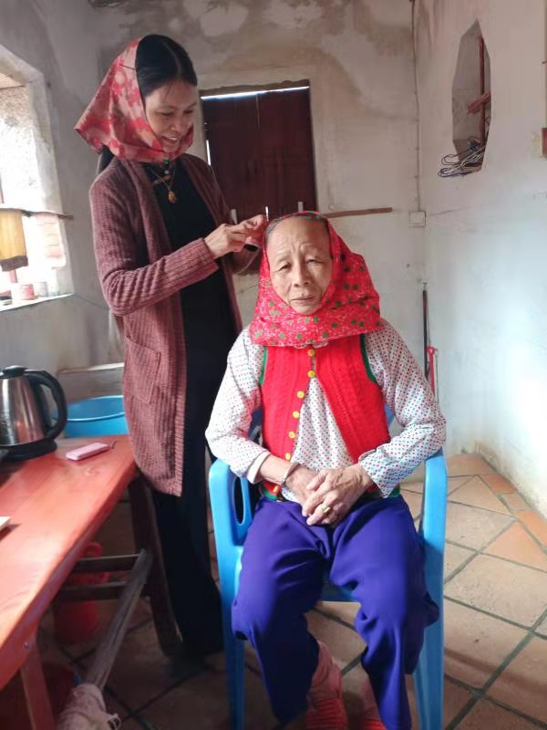 儿媳黄丽英为婆婆梳头。李明珠 摄