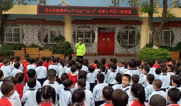 在校园,宣传民警向孩子们介绍了汽车惯性、大货车盲区和如何安全文明出行的交通安全知识,警示教育孩子们过马路时要走人行横道、不跨越隔离护栏、自觉抵制乘坐“三无车辆”。