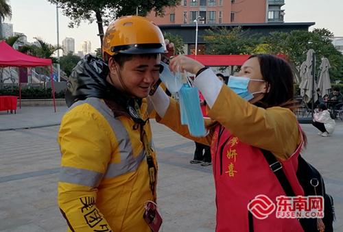 志愿者帮助外卖小哥佩戴口罩。彩燕 供图