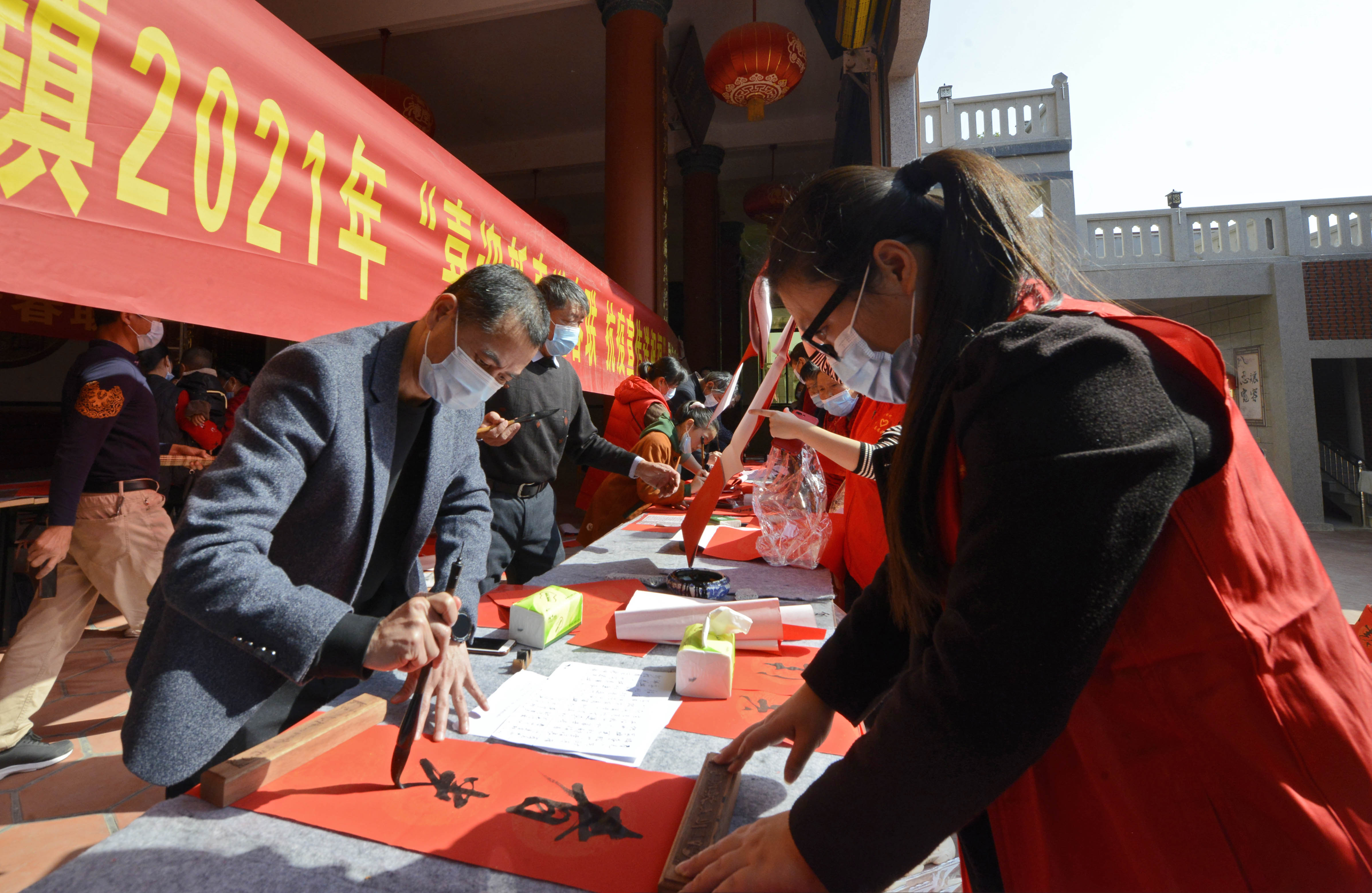 后龙镇邀请书法家为“就地过年”的外来务工人员撰写福字和春联。(泉港区后龙镇供图 林弘梫摄)