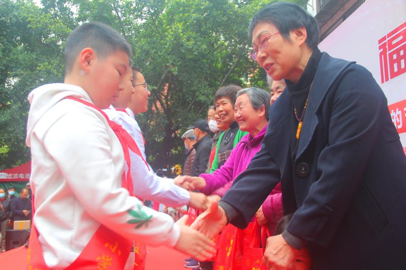 铜盘中心小学的代表上台为军所老干部送“福”袋 鼓楼文明办供图