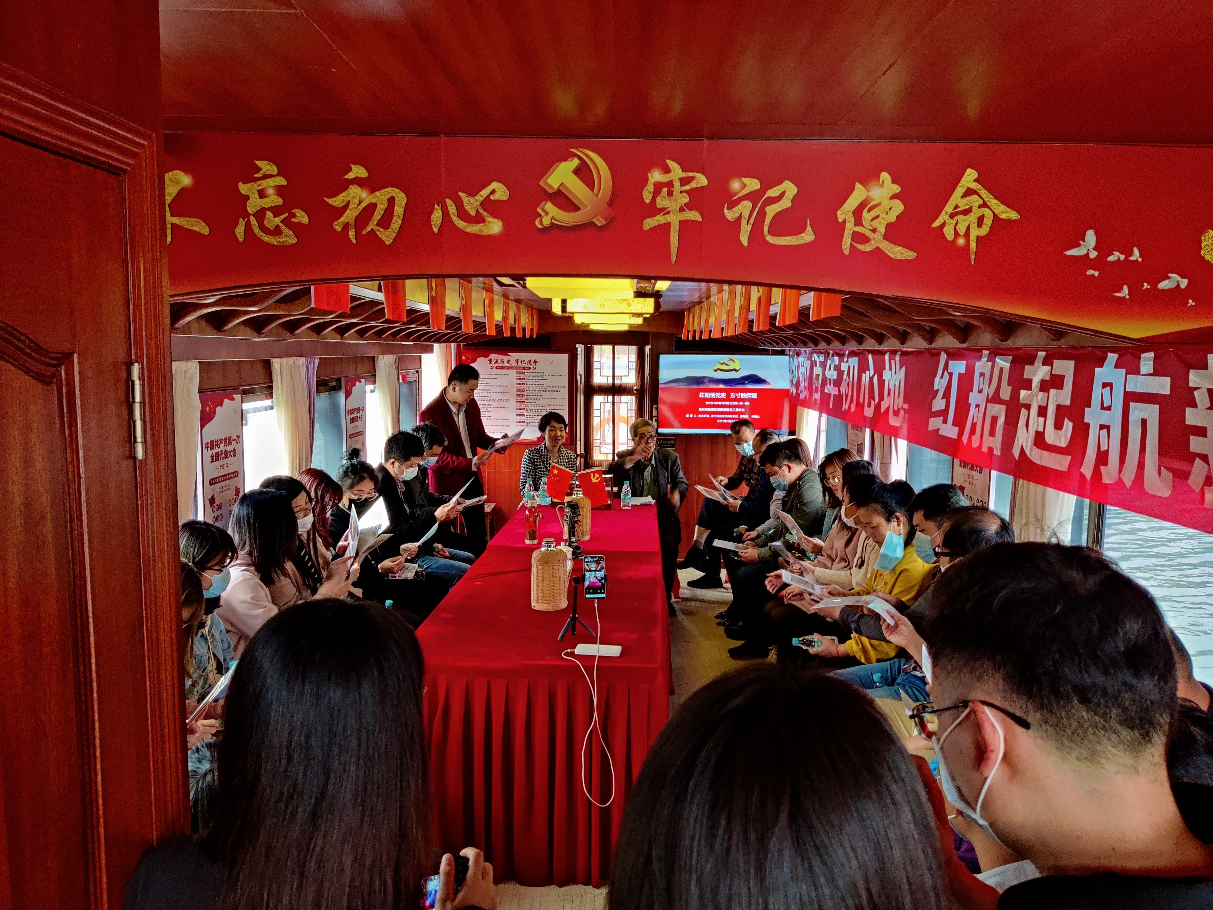 3月18日下午,鼓楼区委文明办联合鼓西街道党工委在西湖公园画舫码头开展“弘扬‘红船精神’ 方寸映照辉煌”庆祝建党100周年“学党史”主题活动。此次活动以“线上+线下”的形式进行,党员干部登画舫、学党史,重温中国共产党的艰苦奋斗历程,接受了一次生动的红色教育。