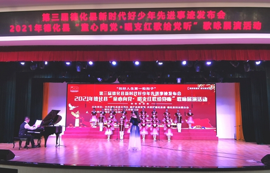 展演活动持续1个小时,孩子们用优美的歌声和舞姿展示广大未成年人的蓬勃朝气和健康向上的良好精神风貌,表达少年儿童祝福党的生日、赞美幸福生活的美好心声。展演结束后,德化县委文明办还将编辑录制光盘参与全市、全省网络展演。