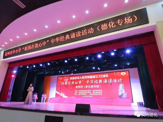 为庆祝中华人民共和国成立72周年,引导中小学生和广大未成年人践行社会主义核心价值观,推进“扣好人生第一粒扣子”主题教育活动深入开展, 11月1日下午,德化县委文明办联合教育局在凤凰山讲堂举办泉州市中小学“祖国在我心中”中华经典诵读活动(德化专场)。