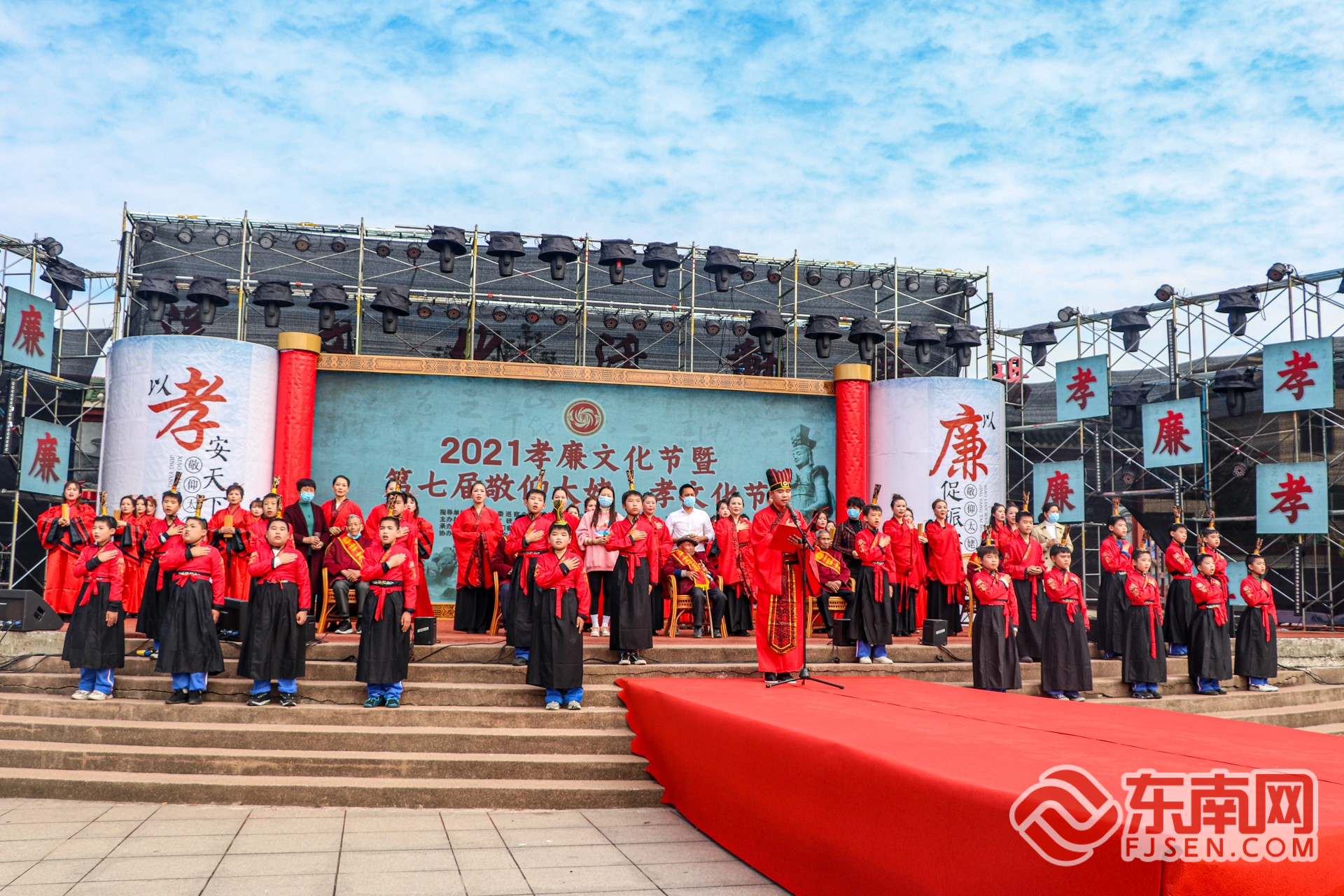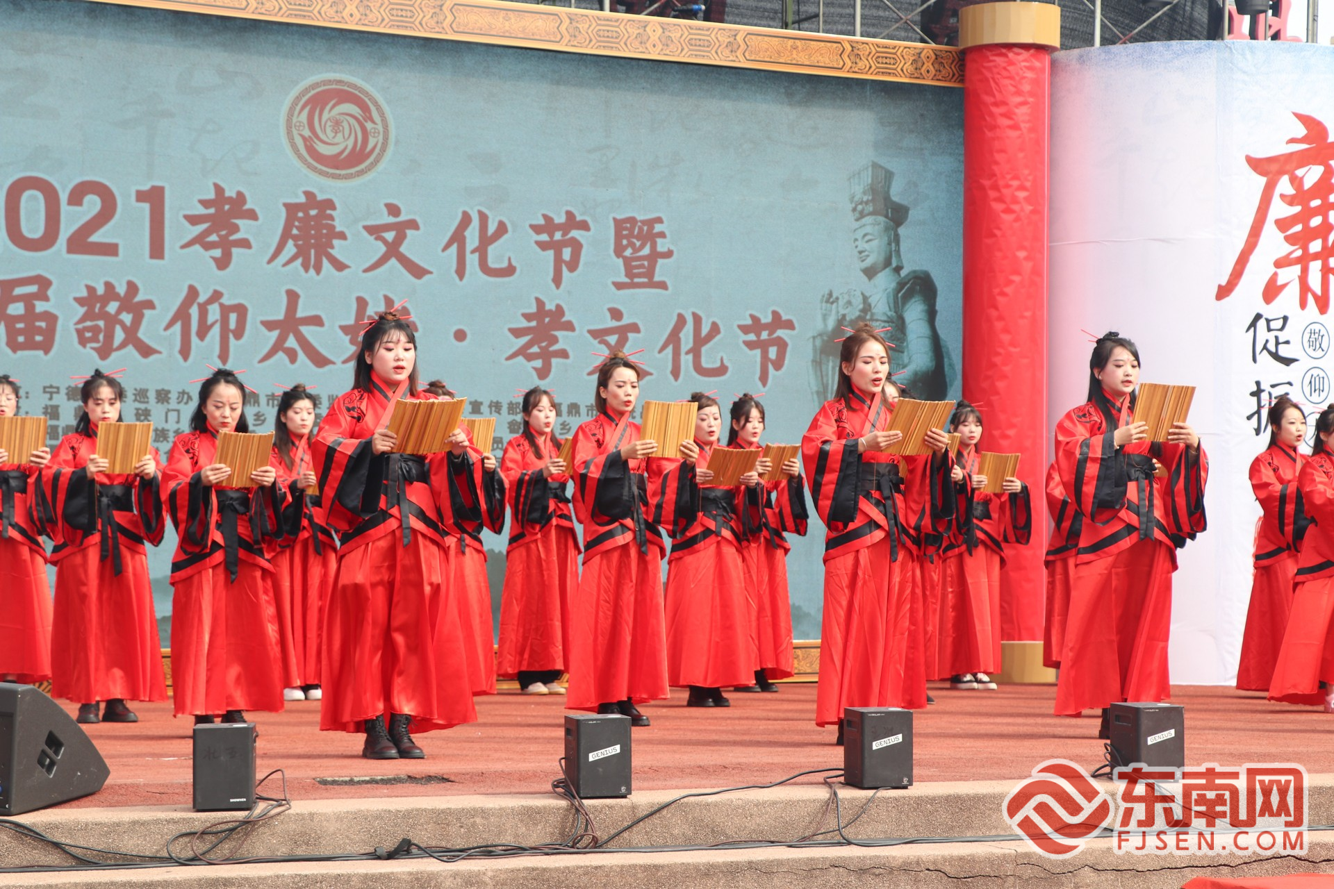 上午10时许,伴随着阵阵鼓声,30多位身着飘逸汉服的女子款款而来,手捧竹简,齐声恭读“祝文”,向观众展示了诵读祝文、敬奉孝茶等一系列传统行孝礼仪习俗。这是当地传统行孝礼仪习俗,已列入宁德市第六批非物质文化遗产。