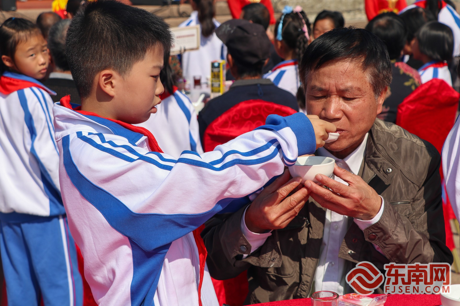 少先队员为老人献上食物。东南网记者 叶伏国摄