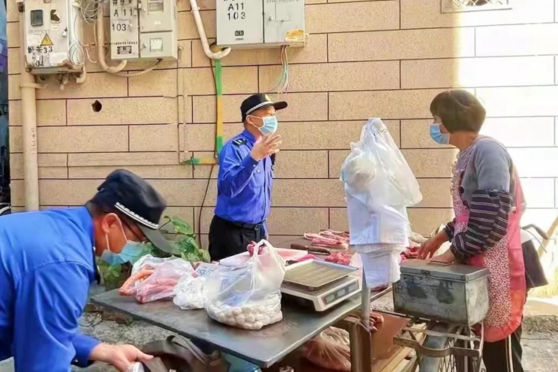 “阿婆,这个您放在路上的货物,不仅占道,造成交通拥堵,还存在一定安全隐患。”日前,在同安区大同街道的一个店门口,正在进行日常市容市貌巡逻的同安区城管局执法队员,发现了一处跨店经营现象,立即上前制止。执法队员有的帮助店主将摆在店外的商品搬到店内,有的与店主、商贩沟通,教育引导。