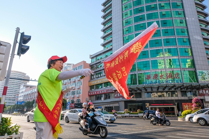 “现在是红灯,请耐心等待。”不管刮风下雨还是烈日当头,在石狮市主要交通路口,总能看见“夕阳红”公共文明引导志愿者的身影,他们手持交通指挥旗,礼貌地劝阻行人和非机动车的不文明交通行为,热情地帮助老、弱、病、残人员安全通行,为过往行人指路。在他们的引导下,文明礼让、文明出行已成为市民的自觉行动,整座城市也变得更有和谐、有序。