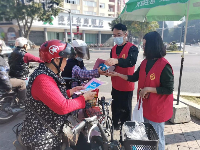志愿者向社区居民、沿街群众发放节能减排倡议书和节电节水宣传手册。漳州市委文明办供图