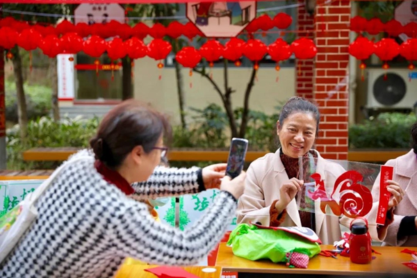 漳州市老干部活动中心邀请剪纸老师现场教社区居民剪“福”字窗花,居民热情参与,展示自己的窗花作品。漳州文明网供图
