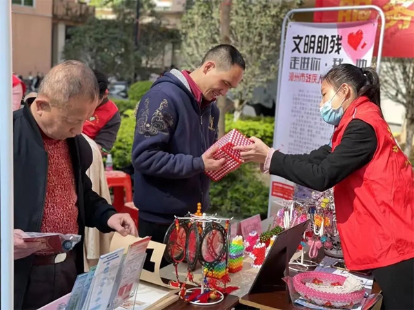 漳州市残疾人作品展示厅结合就业服务进社区活动开展残疾人作品爱心认购。