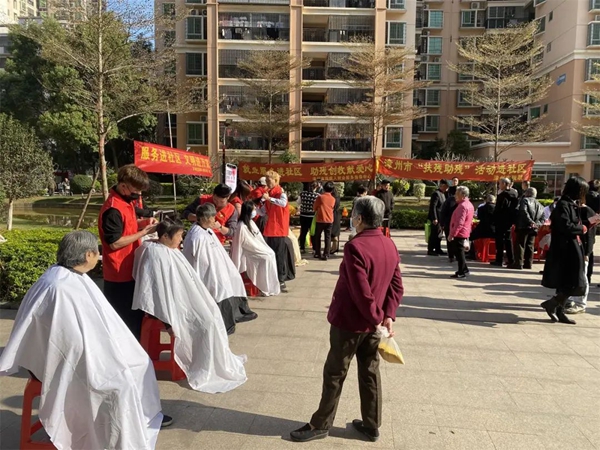 志愿服务队结合就业服务进社区活动为社区残疾人提供美发服务。