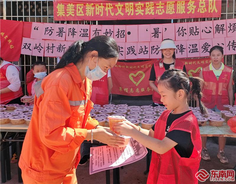文明风8月9日讯(陈秀治)烈日炎炎下,环卫工人等户外工作者默默地为建设美丽城市奉献着自己的力量。8月6日上午,在厦门市集美区灌口镇双岭村两委的支持和指导下,双岭村新时代文明实践站携同双岭村银龄志愿者、草帽志愿者、乡风文明志愿者和党员志愿者开展“防暑降温有妙招•‘暑’你贴心解烦扰”爱心传递志愿服务活动。