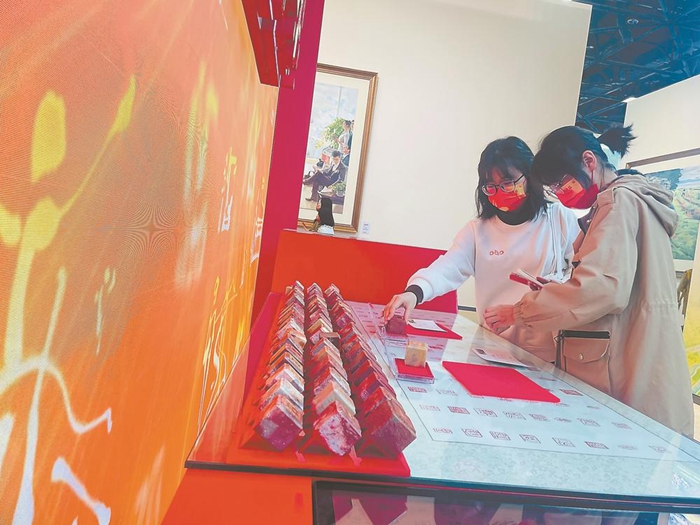 8日,在福建展区“福见百业”互动区,参观者用寿山石印章认真拓福。