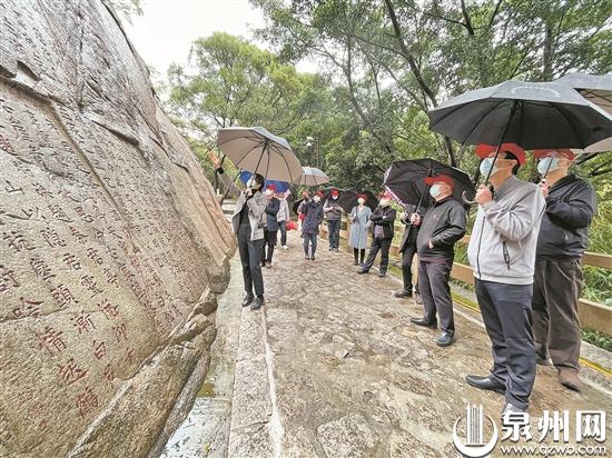 在九日山世遗点,党员干部们一路跟随着讲解员倾听九日山的悠久海交文化历史,尤其是祈风石刻上碑文的详细解说,感受灿烂的“海丝文化”。此外,还开展了文明旅游志愿服务活动,倡导文明旅游、守护世界遗产,树立行业新风,进一步增强机关党员干部的服务发展意识。“作为机关党员干部,同时也是志愿服务工作者,要以泉州申遗成功为契机,守护好、传承好、宣传好世界文化遗产。”市委文明办志愿服务指导科科长王荣锋说。
