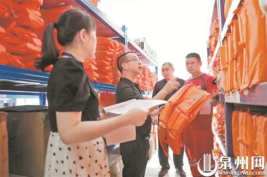 26日,南安市纪检监察干部在防汛物资储备库了解有关情况。 (许雅玲 黄文彪 摄)