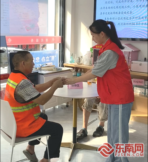 “多亏有了这个避暑纳凉点给我们免费提供茶水、消暑用品,让我们在劳动间隙能够很好地歇歇脚、纳纳凉,补充水分。”7月24日,在宁德市蕉南街道芦坪社区新时代文明实践站内,环卫工人阮芳崇吹着空调喝着凉茶高兴地说。