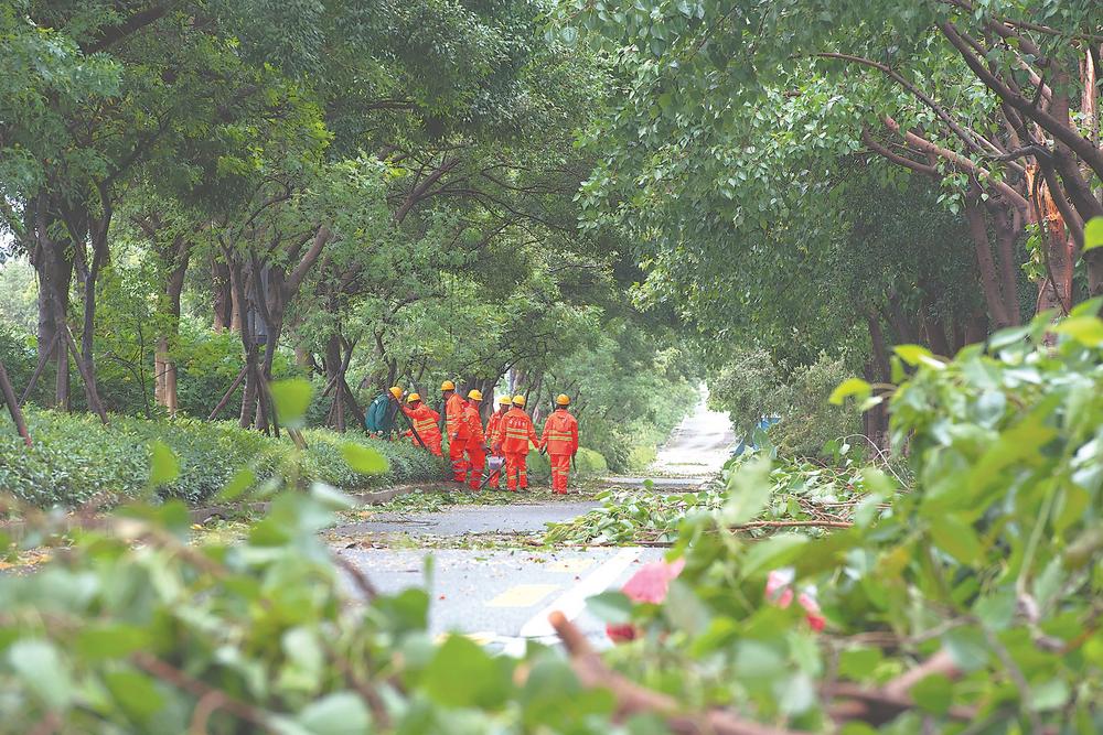 29日,晋江市政、环卫等部门组织人手清理路面倒伏树木和飘落垃圾,加快恢复城市道路的正常通行。福建日报记者 王毅 摄