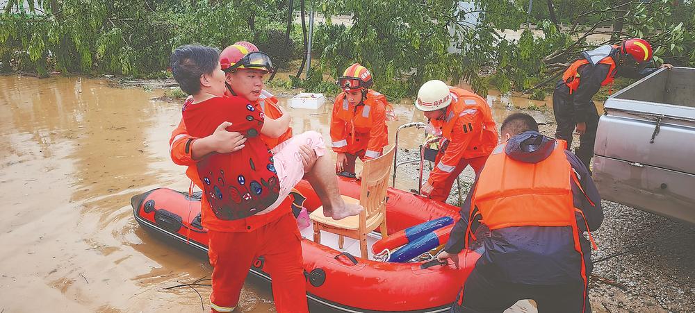 29日上午,泉州市洛江区河市镇白洋大队寨脚22号房屋被淹,2人被困。双阳消防站救援人员成功转移被困人员。福建日报记者 王敏霞 通讯员 林亚美 叶金玉 摄