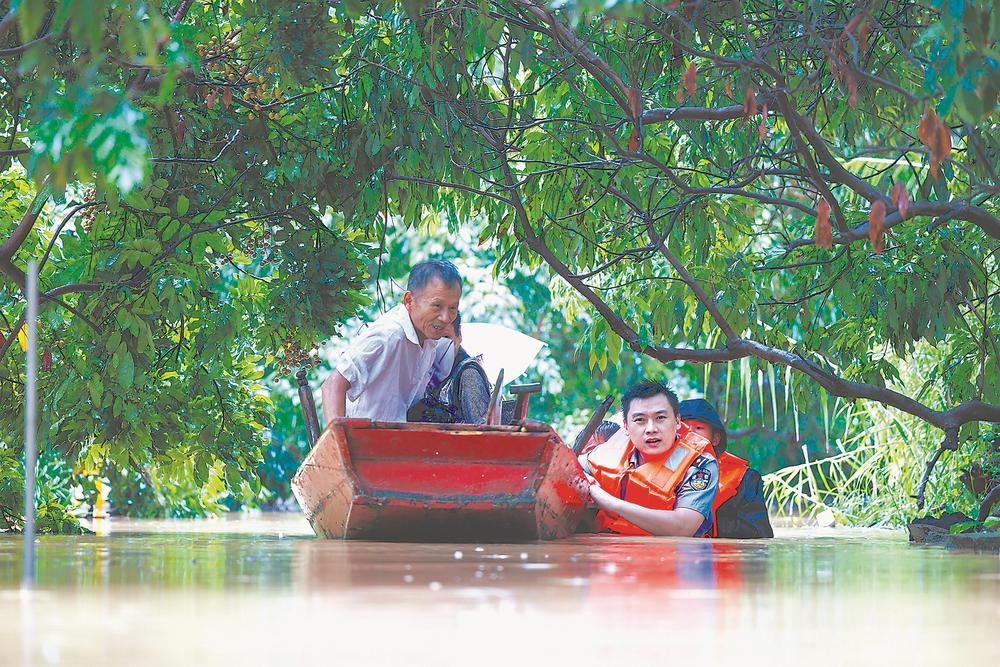 29日,莆田市涵江区梧塘镇溪游村全村被淹没,莆田市公安局涵江分局民警在梧塘镇溪游村转移受灾群众。福建日报记者 林爱玲 通讯员 林鸿达 摄