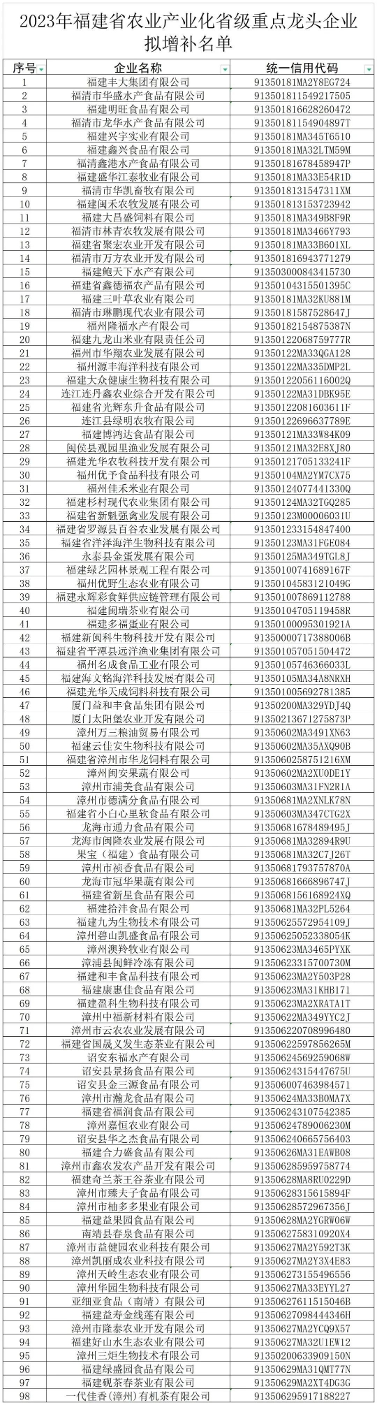 2023年福建省农业产业化省级重点龙头企业拟增补名单