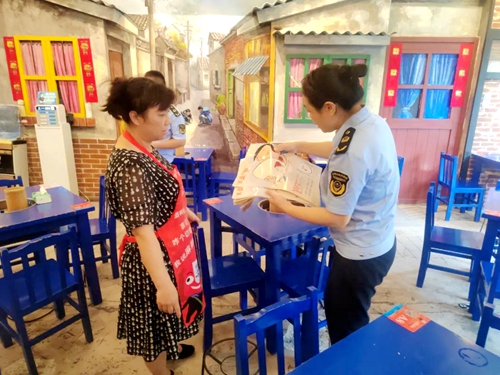 向餐饮商家宣传发放“厉行勤俭节约 制止餐饮浪费”宣传单 过文司政 摄