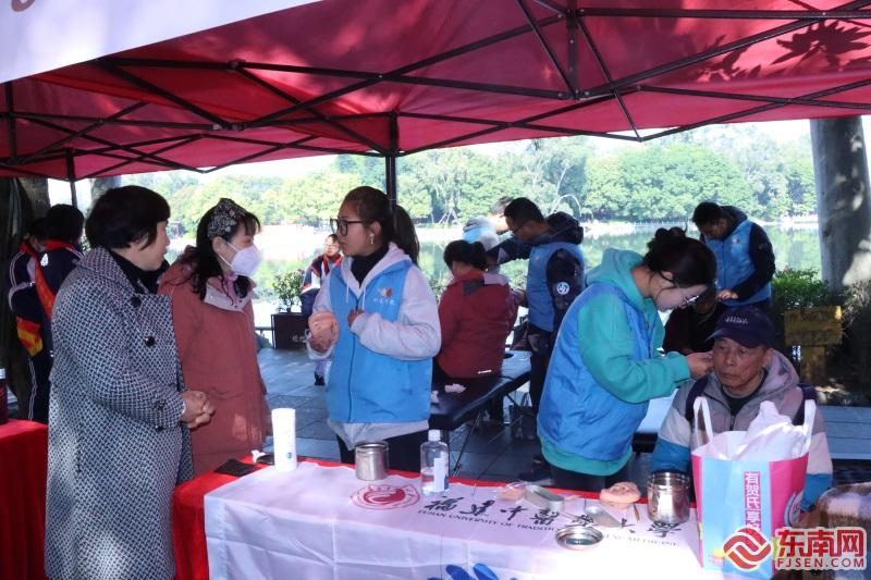 东南网3月3日讯(本网记者 卢金福)“我这只脚有点痛,不知道怎么回事。”“您平常腰会疼吗?这个可能是筋膜炎,可以拿小球在地上来回踩……”今日上午,在第61个“学习雷锋日”、第25个“中国青年志愿者服务日”到来之际,“建功新时代 志愿更精彩”——3·5“学雷锋”志愿服务活动在福州市西湖公园晨曦广场举行,高校青年志愿者给市民带了义诊、法律咨询、小家电维修等服务。共青团福建省委、共青团福州市委、鼓楼区等省市有关单位领导,在榕高校青年志愿服务队和社区代表等参加。