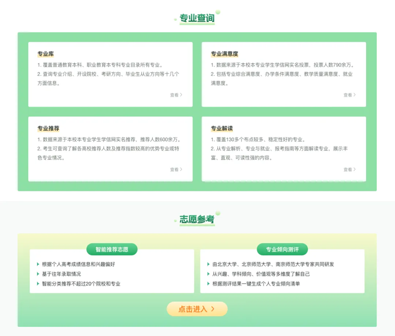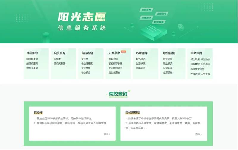 院校查询集合了院校库和院校满意度两个部分。院校查询展示了当年的招生高校。点击进入后可查看高校的基本信息、招生章程、学校及其专业介绍等信息。院校满意度则来源于本校学生学信网的实名投票,累计投票人数达500余万。
