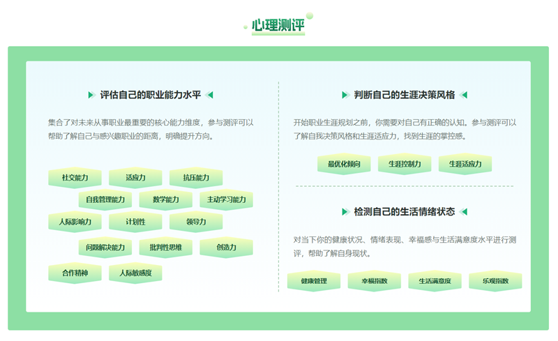 心理测评功能提供能力素养、生涯决策、态度评价三个部分内容。测评为北京大学、北京师范大学、南京师范大学心理测评团队联合研发。旨在帮助学生了解自身优势与不足、决策风格、心理健康情况等,测评报告将提供引导建议。职业前景功能提供职业去向、职业解读、认识职业、生涯课堂等部分。其中职业去向提供相关专业毕业生就业及职业发展情况,可通过添加专业类了解不同类型高校大致情况。