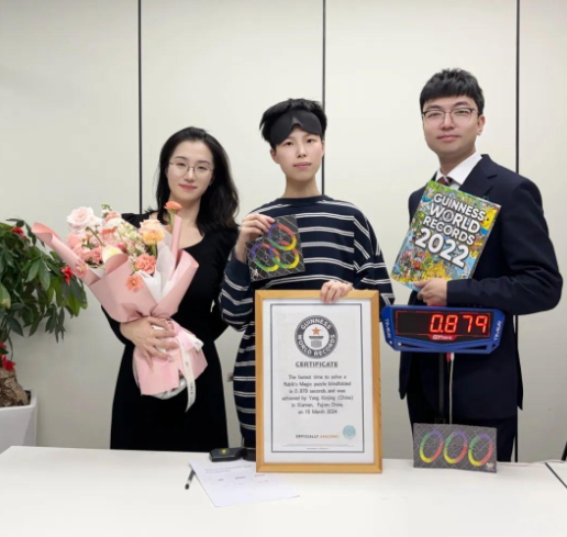 3月26日,“00后”益智竞技游戏爱好者杨心静收到一封来自吉尼斯世界纪录管理团队的电子来信,她以0.879秒的速度打破了“Fastest time to solve a Rubik's Magic puzzle blindfolded(最快时间盲解魔板)”的吉尼斯世界纪录。