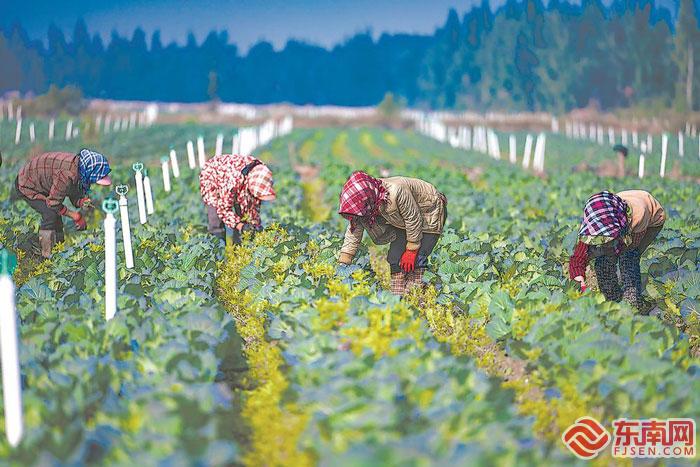 村民们在幸福洋一期田地里采收花菜和包菜。