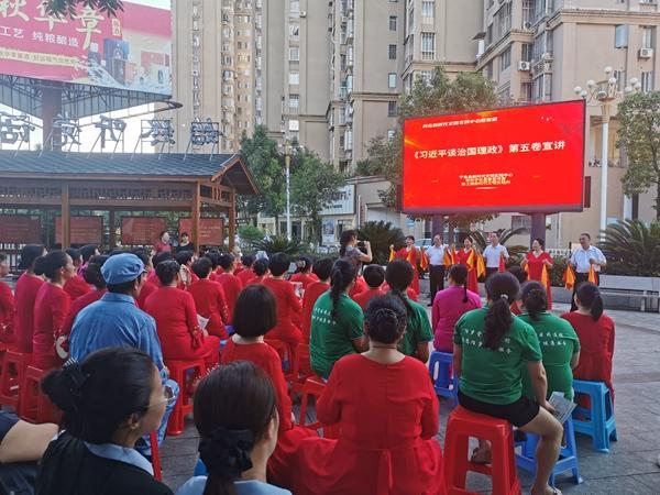 在宁化县新时代文明实践中心广场,翠江镇新时代文明实践所文艺宣讲队手持竹板,绘声绘色向市民群众宣讲《习近平谈治国理政》第五卷内容。