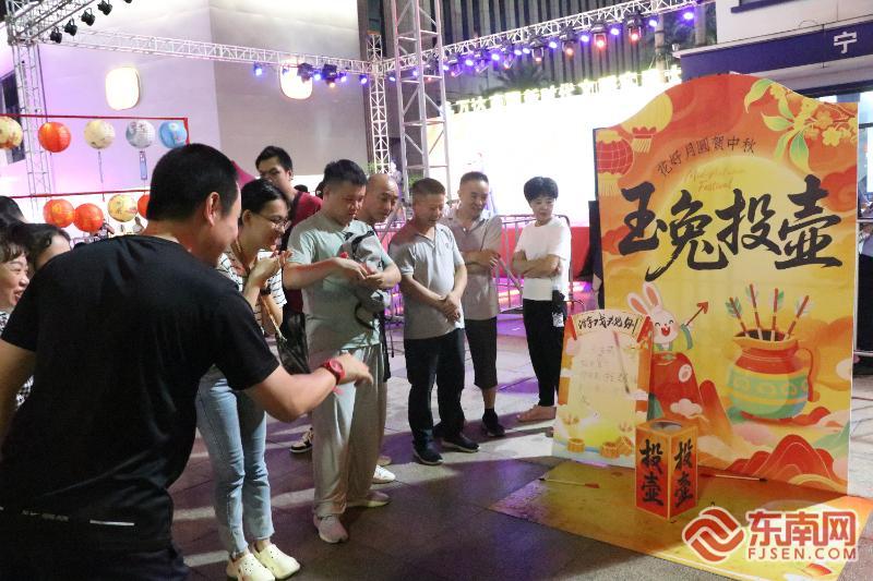 除精彩演出外,活动创新设置的四大互动体验打卡区前,更是排起了长队,中秋传统元素与沉浸式体验的深度结合,让市民热情高涨。其中,玉兔投壶区复刻明代玩法,市民手执芦苇箭矢投掷,体验传统雅趣;后羿射日区依托神话背景,市民化身“英雄后羿”拉弓搭箭,感受传说中的力与勇;嫦娥奔月区通过场景化设计,让市民沉浸式“玩转”千年传说;灯谜竞猜区悬挂200盏竹编灯笼,市民三五成群在解谜中重拾传统民俗记忆。