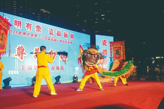 启动仪式当天,“文明有象 瓷都新风”文艺汇演精彩上演,现场洋溢着文化艺术的鲜活气息。活动现场,暖场视频率先拉开序幕。镜头里,德化的千年陶瓷文化、秀丽自然风光与现代城市风貌缓缓展开,帧帧画面勾勒出这座城市的独特魅力,提前点燃了观众的期待。随后,文艺汇演正式登场,成为展现德化文明新风与文化特色的核心舞台。开场的《尊美南狮》表演,由美湖尊美南狮表演队倾情呈现。队员们将闽南武术的刚柔并济与狮舞完美融合,激昂的鼓点中,雄狮腾跃、辗转腾挪,展现了中华武术的精气神,刚一亮相便瞬间点燃全场气氛。