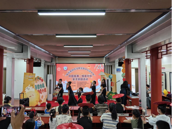 爵士舞《爵起》、舞蹈《中秋月儿圆》、电吉他弹唱《不再犹豫》、“金奖舞蹈”《傣迪》等精彩的节目为活动拉开了序幕。亲子游园环节中,孩子和家长在讲解员的带领下集体参观了新时代文明实践中心后,每组亲子自由选择参与各项趣味活动。灯笼制作体验区,工作人员引导参与者发挥创意,亲子共同制作出了一个个精美的灯笼;《投中你》《兔子钓月饼》游戏充满趣味,家长和孩子默契配合,现场笑声不断;拍照打卡区热闹非凡,亲子纷纷留下美好的瞬间。