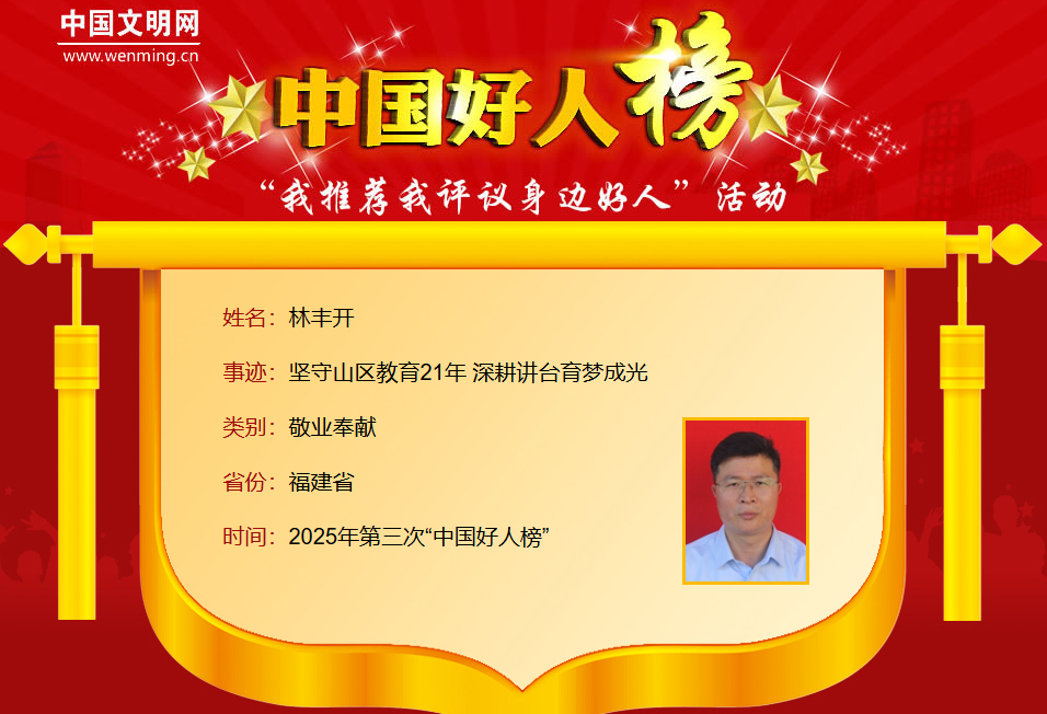 林丰开,男,1973年11月生,中共党员,福建省泉州市永春美岭中学高中生物学教师。他情系农村教育,扎根山区精耕三尺讲台二十余年,以“让山里孩子享有同等教育”的信念,在办学条件艰苦、生源基础薄弱的困境中辟路前行。他创新教学方式唤醒课堂活力,以一年多坚持单程近500公里的奔波,坚守“不缺一节课”的承诺。他用21年的执着与坚韧,培育100余名反哺乡村人才,书写了山区教师的奉献之歌。林丰开曾获全国优秀教师、全国中小学优秀班主任、福建省优秀农村教师等荣誉。