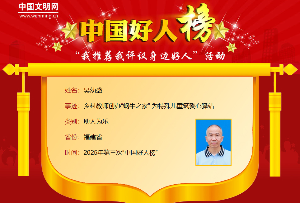 吴幼盛,男,1971年6月生,福建省漳州市诏安县白石小学高级教师,公益组织“诏安县蜗牛之家”创建人。吴幼盛是一名乡村教师,也是一位唐氏综合征患儿的父亲,他联合其他6名特殊儿童家长共同创办了公益组织“诏安县蜗牛之家”,致力于为县域内的特殊儿童及其家庭提供专业支持、情感关怀和社会融入平台。2022年,在诏安县委文明办的牵头下,“蜗牛之家”加入诏安县民政局登记注册的诏安县爱心义工协会,成为其15队。创办“蜗牛之家”以来,吴幼盛倾注大量心血,将其打造成特殊儿童成长的温暖驿站、130余个特殊家庭互助的爱心港湾。