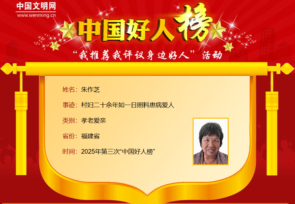 朱作芝,女,1953年8月生,福建省宁德市寿宁县芹洋乡广地村村民。二十多年来,朱作芝精心照料双目失明并瘫痪在床的丈夫,用柔弱的肩膀撑起整个家庭,成为丈夫的“眼睛”和“手脚”。这份日复一日的坚守和付出,让朱作芝成为当地孝老爱亲的典范,她的故事在邻里乡亲中广为传颂。