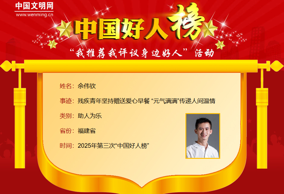余伟钦,男,1993年9月生,福建省厦门市早龙早餐摊摊主。作为一位后天性脑性瘫痪患者,余伟钦始终以积极乐观的态度对待生活。他在自己早餐摊位上放了一块牌子,上面写着如果没有收入或遇到困难,只要说出“来份‘元气满满早餐’”,就可以免费打包带走一份早餐。这个活动从他开始卖早餐就有了,因为他自己也曾经挨过饿,所以希望能给他人帮助。他用“元气满满的早餐”帮助暂时有困难的人,传递着自己的善意,也传递着城市的温暖。