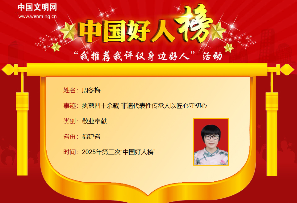 周冬梅,女,1967年11月生,中共党员,福建省南平市浦城县图书馆高级工艺美术师、国家级非物质文化遗产浦城剪纸国家级代表性传承人。周冬梅投身剪纸艺术领域已有四十多年,她把自己毕生的心血都倾注在了非遗的保护传承以及创新发展工作当中。她带领团队成功打造了“剪花嫂”等品牌,还开发出一系列深受市场欢迎的非遗文创衍生产品。在技艺方面,她对剪纸传统手工技法加以改良,首创使用眼科手术剪进行剪纸创作,使得剪纸的图案花纹更加细腻精美,这一创新也助力浦城剪纸非遗技艺走向国际,走出国门。此外,她还热心公益事业,长期坚持免费带徒授艺,在她和团队的共同努力下,团队获评福建省“最佳志愿服务组织”。周冬梅曾获全国三八红旗手、全国古籍保护工作先进个人、福建省乡村工匠名师等荣誉。