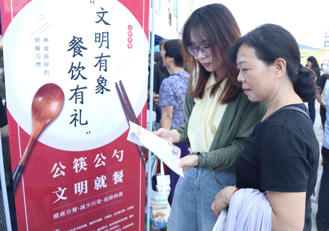 活动期间,工作人员通过设置宣传台、摆放宣传展板,介绍《市民文明规范手册》等形式,以直观易懂的方式,向市民普及“光盘行动”“公筷公勺”等文明餐饮知识,积极倡导大家养成健康、卫生、文明的用餐方式,用实际行动做文明餐桌的宣传者、践行者。