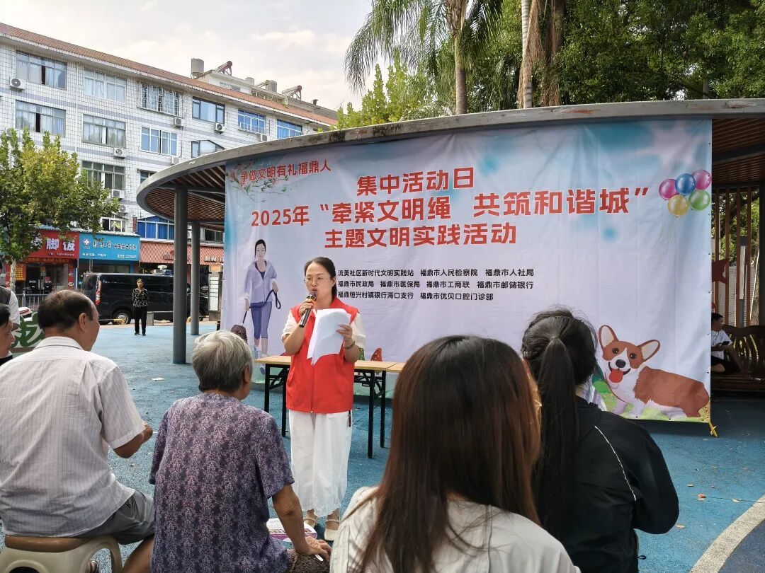 与此同时,福鼎市流美社区的“牵紧‘文明绳’ 共筑和谐城”文明实践活动同样温情上演。“文明养犬承诺墙”前,居民们郑重签名,许下一份文明约定。志愿者现场示范如何挑选合适的牵引绳,民警则结合案例详解《城市养犬管理条例》,强调“遛狗牵绳不仅是对规则的遵守,更是对老人、孩子的保护”。